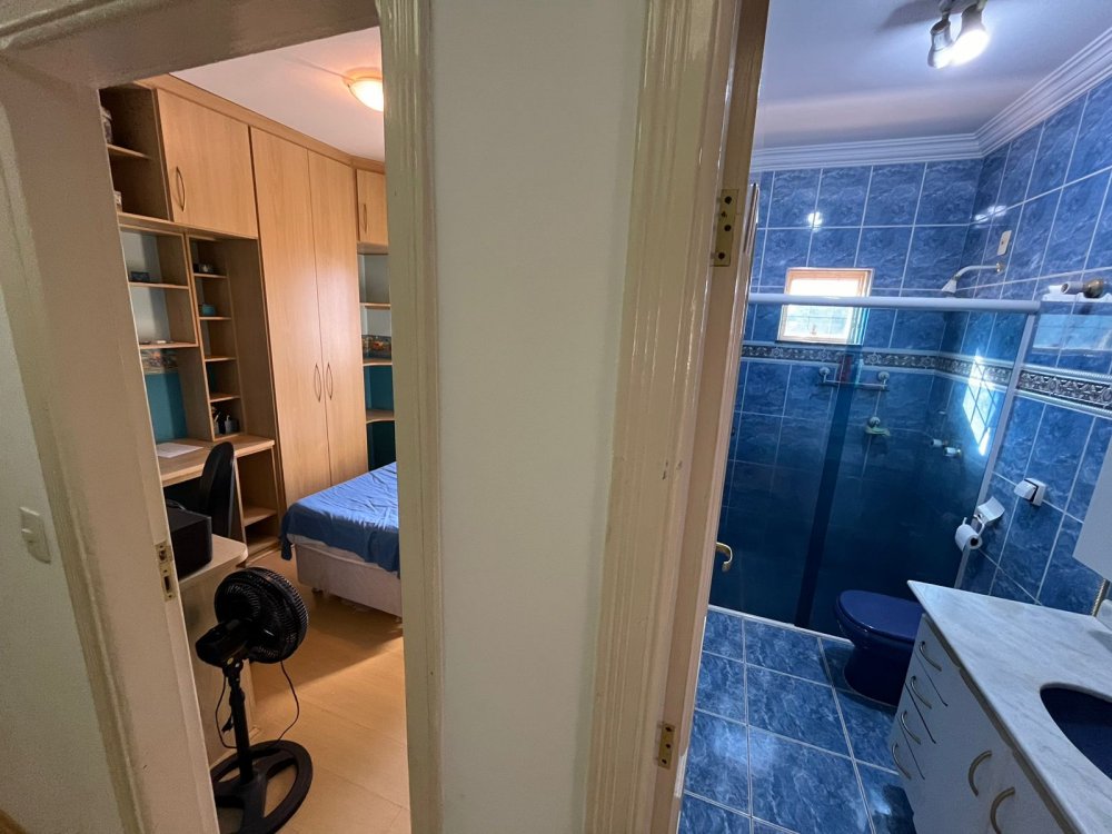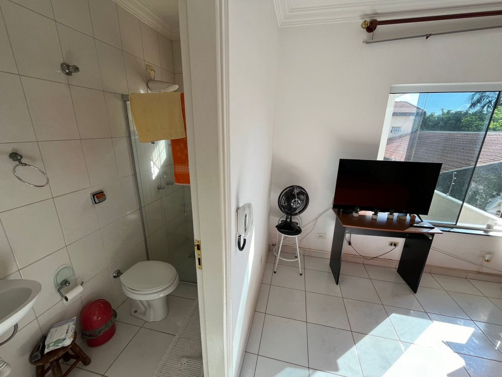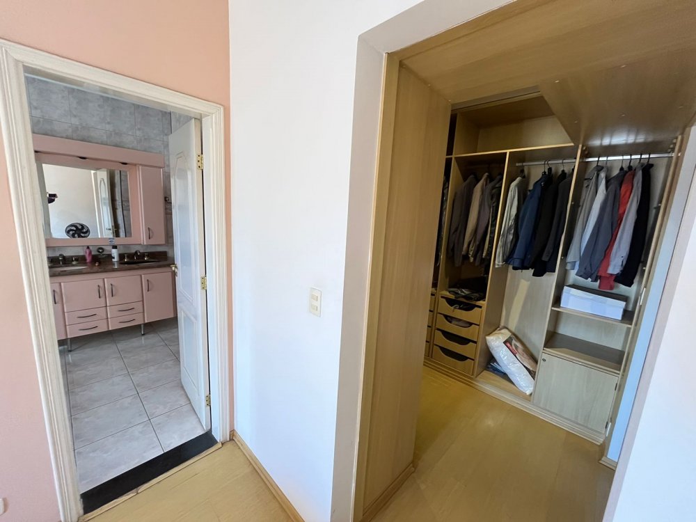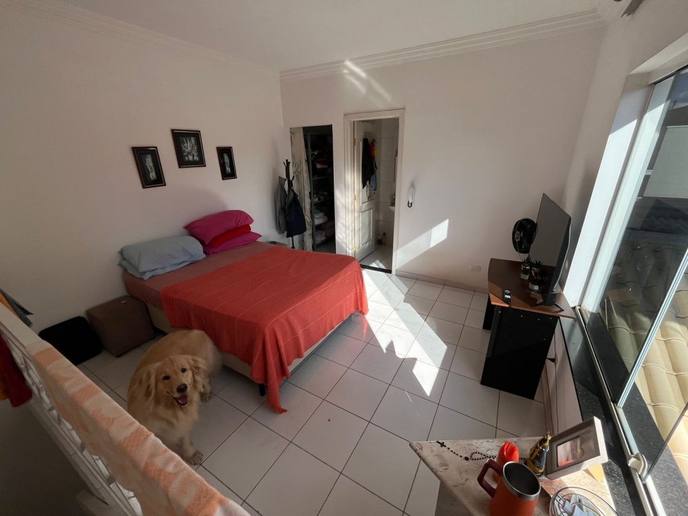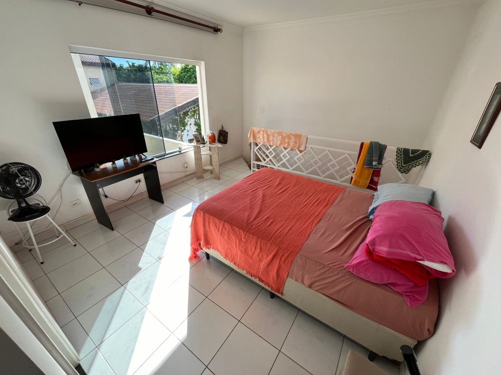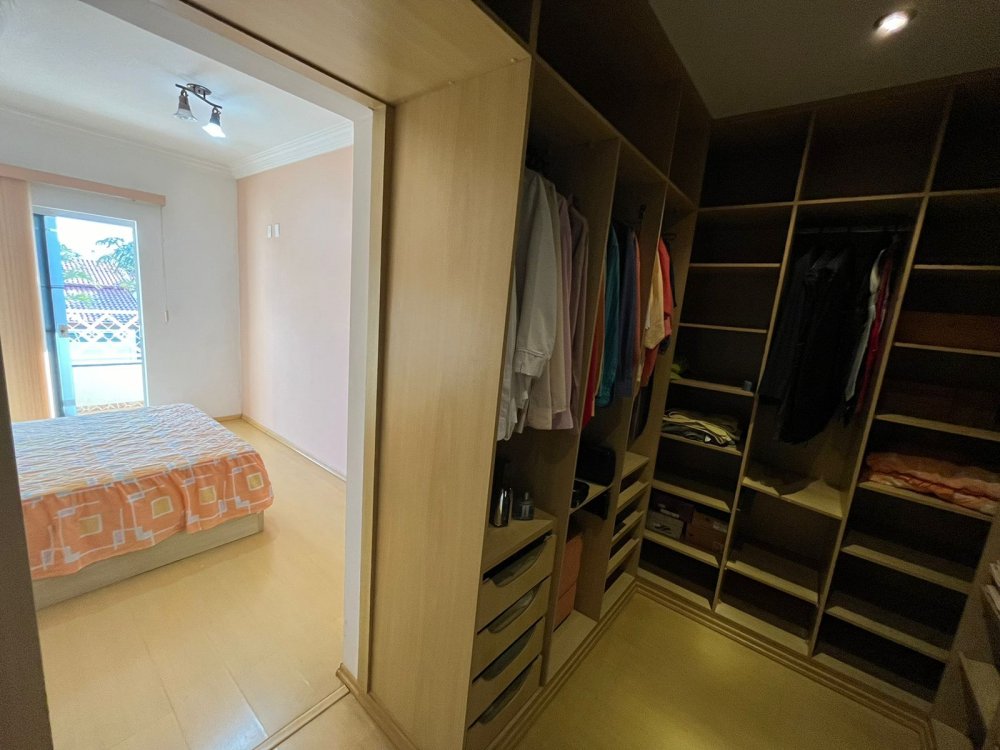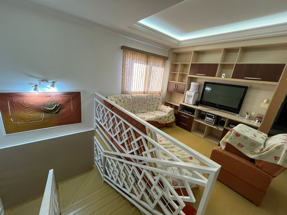 PISO DE CIMA DA CASA DA FRENTE: possui sala de tv, banheiro social, corredor de circulação e 3 dormitórios completos de armários (sendo o dormitório da suíte máster com destaques para o belo closet e área de banho com bastante espaço com banheira). O dormitório suíte é virado para a rua conectado a sacada estendida com uma vista panorâmica para o bairro.