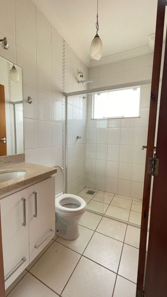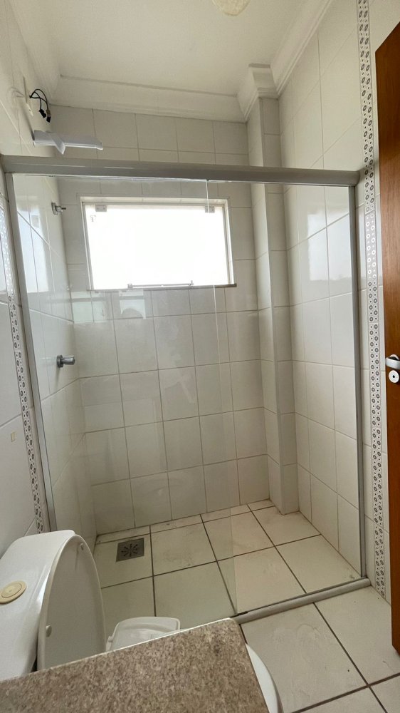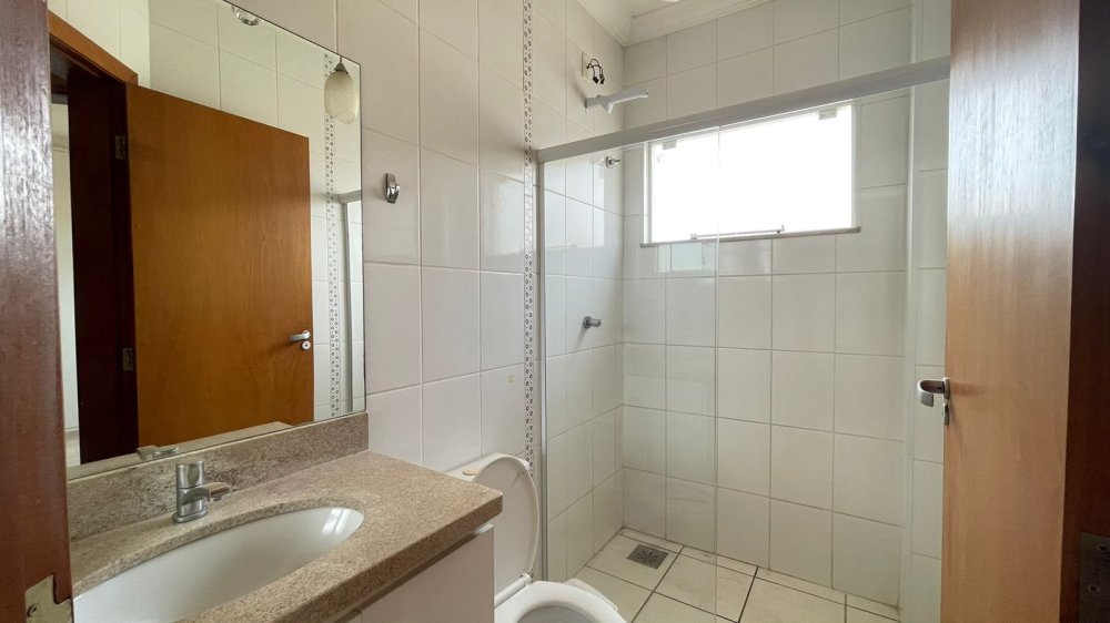 01 banheiro social com box, pedra de mármore com cuba de sobre por e gabinete.