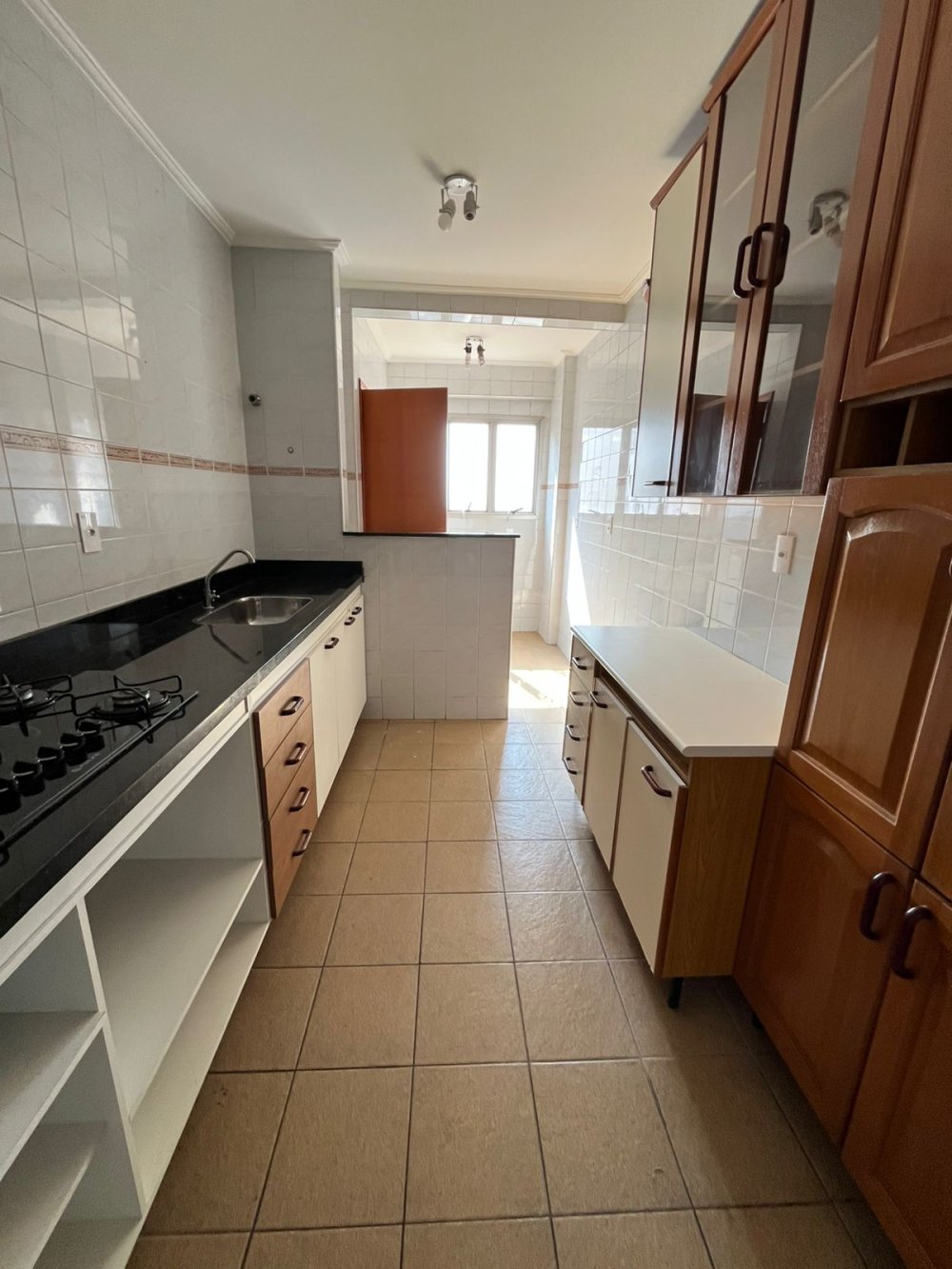 Cozinha com cooktop completíssima de armários e nichos planejados com espaço já montado para forno e microondas.