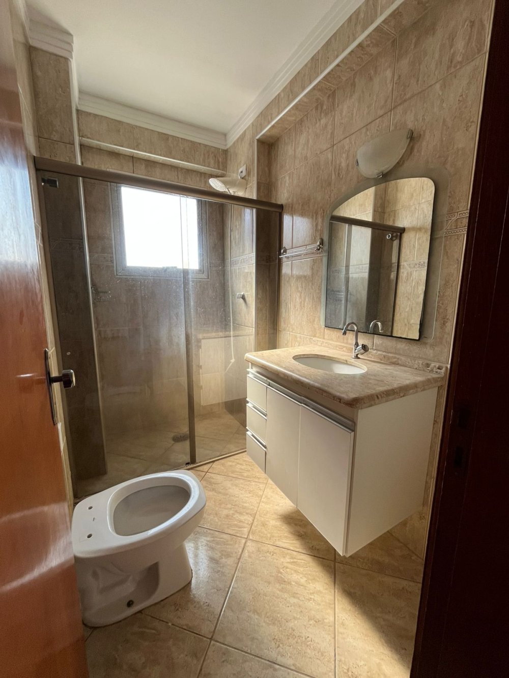 Hall com corredor de circulação. 1 wc social principal está completo com armários, pedra de mármore travertino vintage com cuba esculpida , box blindex e espelho.