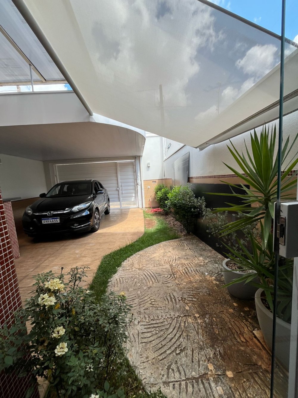 Área frontal acomoda 2 vagas cobertas de garagem com portão eletrônico.