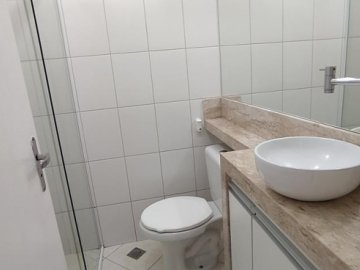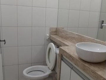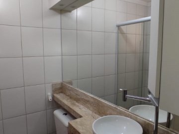 1 WC SOCIAL COMPLETO COM ARMÁRIO, AMPLO ESPELHO, PIA EM MÁRMORE TRAVERTINO COM CUBA DE SOBREPOR E BOX EM VIDRO BLINDEX.