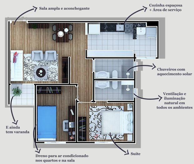 Uma planta ampla e bem distribuída. Cozinha espaçosa, sala ampla com 2 ambientes com varanda, 2 dormitórios (uma suíte), banheiro social, uma vaga de garagem e 2 elevadores.