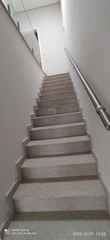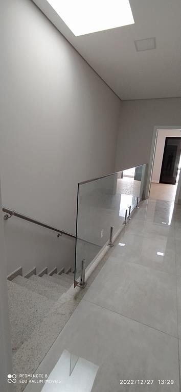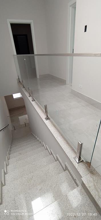 2 Varandas estendidas (frente e fundo), todos ambientes com lustres / luminárias, área de serviço, escada em granito e guarda corpo com blindex e corrimão de alumínio, piso porcelanato que imita madeirado nos dormitórios, portas balcão preta em alumínio com pintura eletrostática, janelas em blindex.