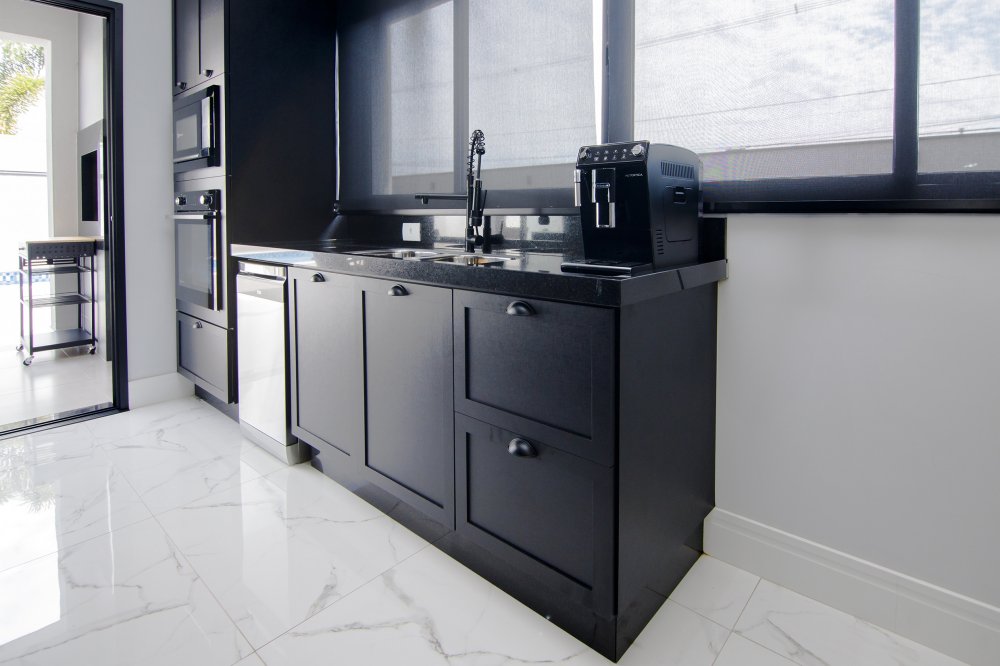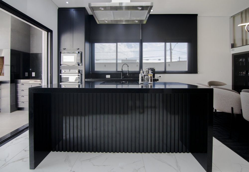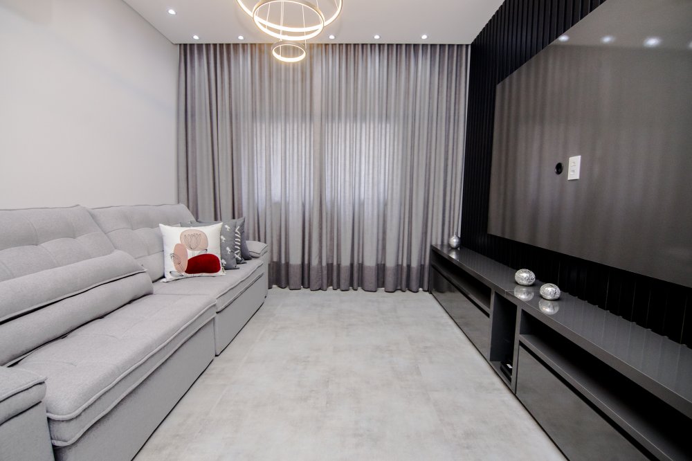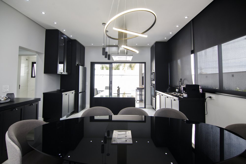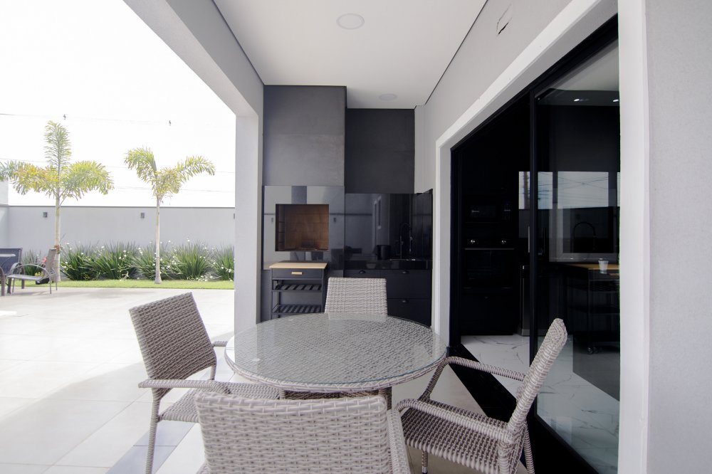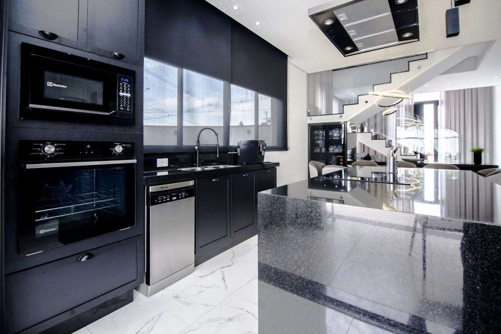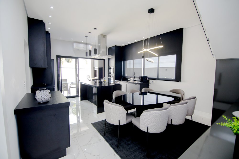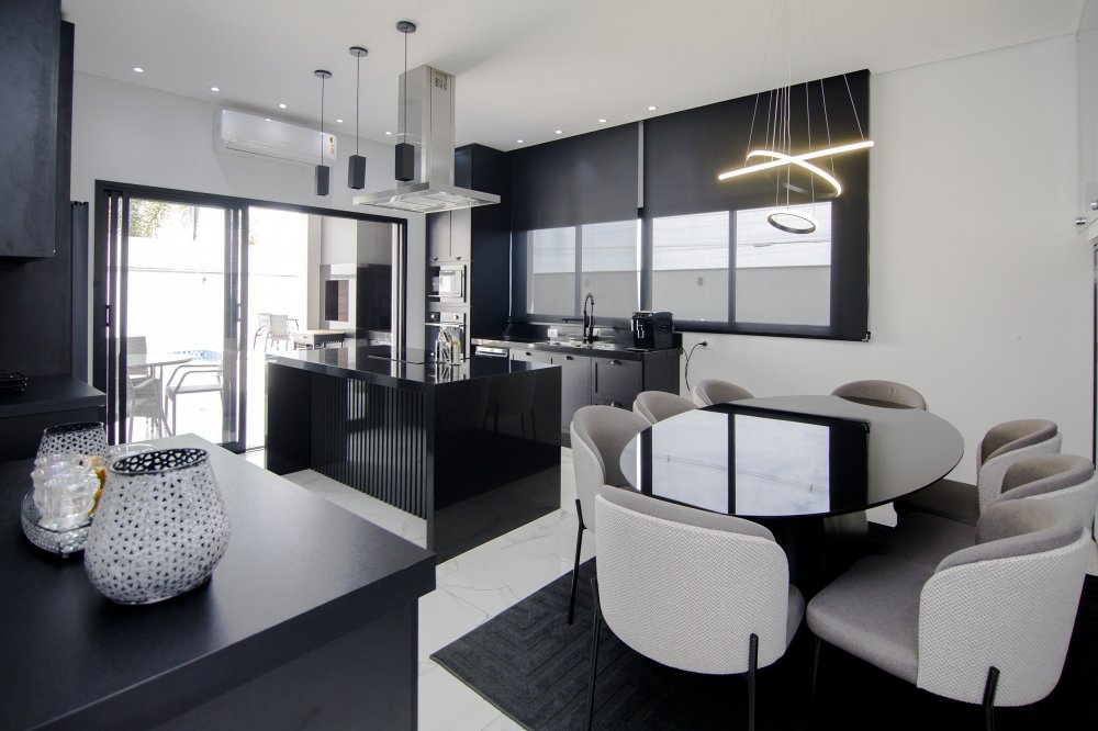 A FACHADA TODA IMPONENTE ESTILO NEO COLONIAL, toda com esquadrias em alumínio preto, sala 2 ambientes, integradas com cozinha toda planejada e com os eletrodomésticos.