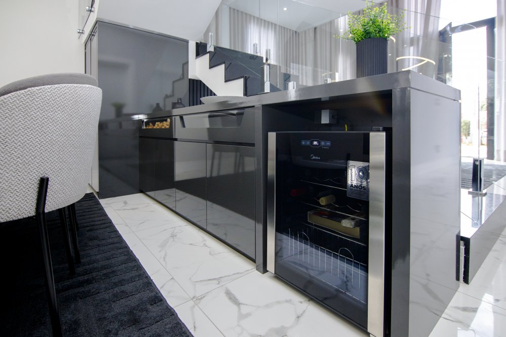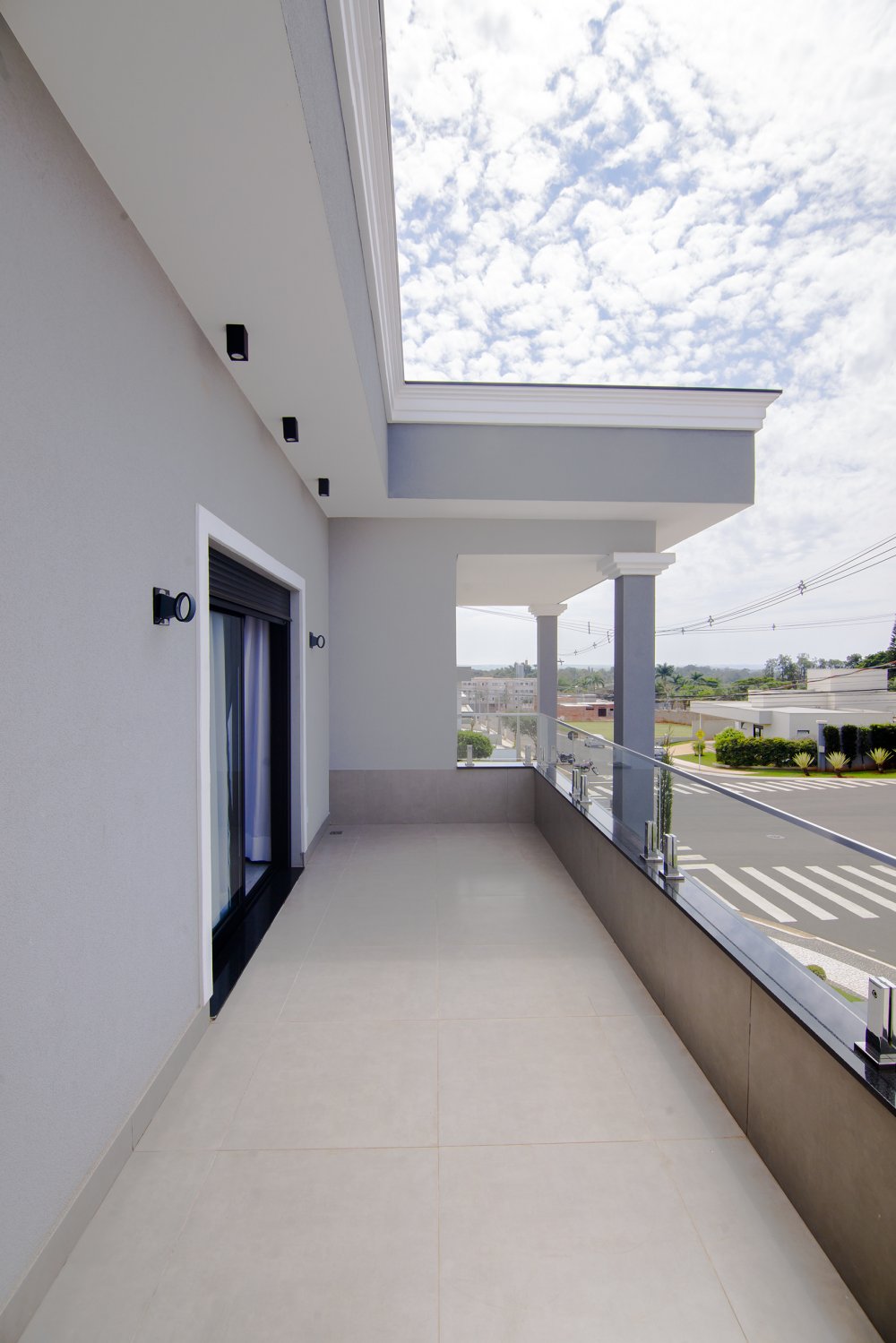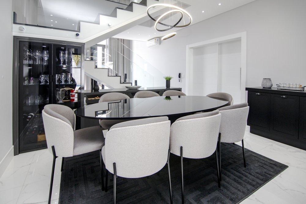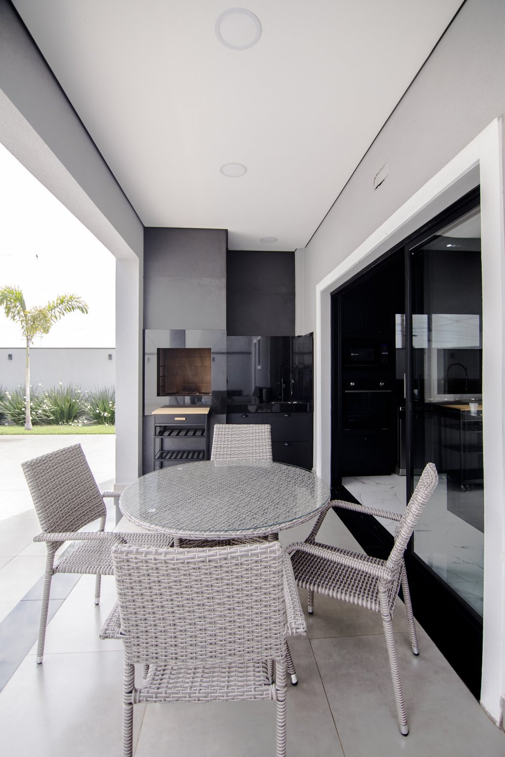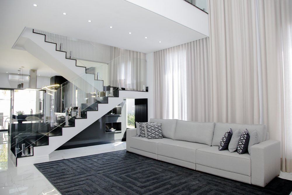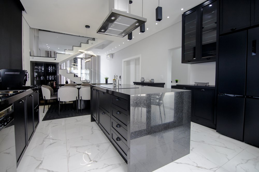 A FACHADA TODA IMPONENTE ESTILO NEO COLONIAL, toda com esquadrias em alumínio preto, sala 2 ambientes, integradas com cozinha toda planejada e com os eletrodomésticos.